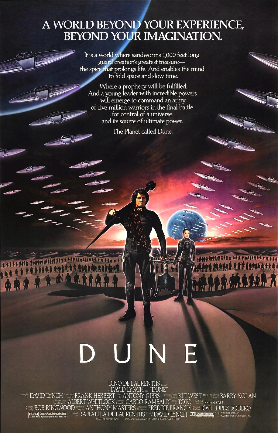 Dune is a 1984 sci-fi film about Paul Atreides' journey from royal heir to revolutionary. The film is directed and written by David Lynch, based on Frank Herbert's book of the same name and was the second attempt at adapting the book into a visual medium after Alejandro Jodorowsky's never made film, as well as the first to actually make it to celluloid. The film stars Francesca Annis, Leonardo Cimino, Brad Dourif, José Ferrer, Linda Hunt, Freddie Jones, Richard Jordan, Kyle MacLachlan, Virginia Madsen, Silvana Mangano, Everett McGill, Kenneth McMillan, Jack Nance, Siân Phillips, Jürgen Prochnow, Paul L. Smith, Patrick Stewart, Sting, Dean Stockwell, Max von Sydow, Alicia Witt, and Sean Young. The film had its world premiere at the Eisenhower Theater in Washington D.C. on December 3, 1984, and was released a week and a half later on December 14.