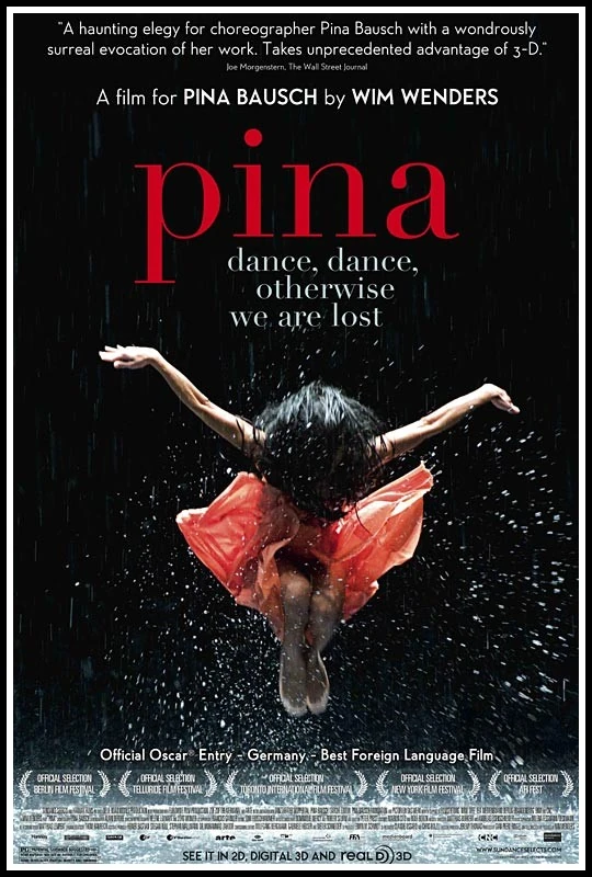 Pina is a 2011 German 3D dance film directed by Wim Wenders. During the preparation of the documentary about dancer Pina Bausch, she died unexpectedly. Wenders cancelled the film production, but the other dancers of Tanztheater Wuppertal convinced him to make the film anyway. It now shows these other dancers, talking about her and dancing in her honor, not just in the theater, but most of the time at various outdoor locations.