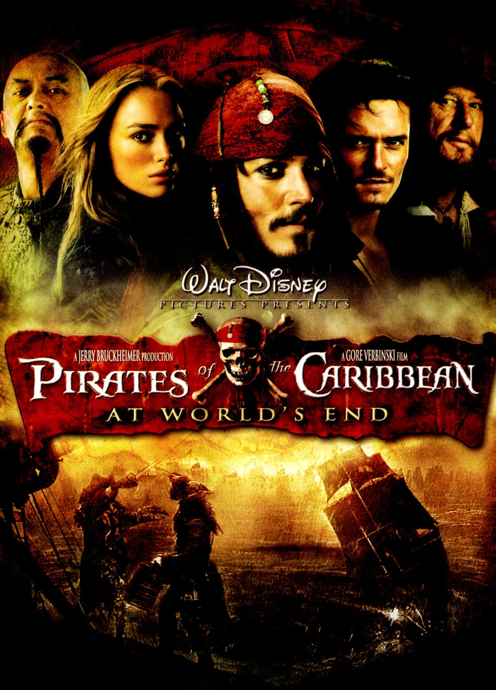 Pirates of the Caribbean: At World's End is a 2007 American adventure fantasy swashbuckler, the third film in the "Pirates of the Caribbean" series. Gore Verbinski directed the film, as he did with the previous two. It stars Johnny Depp, Orlando Bloom, Keira Knightley, Geoffrey Rush, Chow Yun-Fat, Jack Davenport, Bill Nighy, Kevin McNally, Tom Hollander, Jonathan Pryce, Stellan Skarsgård, Naomie Harris, Lee Arenberg, Mackenzie Crook and Keith Richards.
